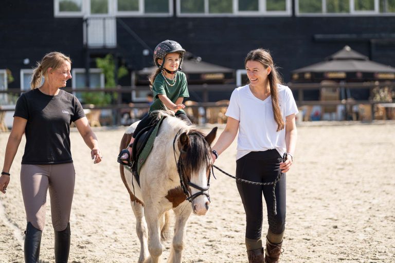 Samen met één ouder ga je een deel van de les een pony poetsen en een deel rijden. Tijdens het rijden loopt de ouder mee.